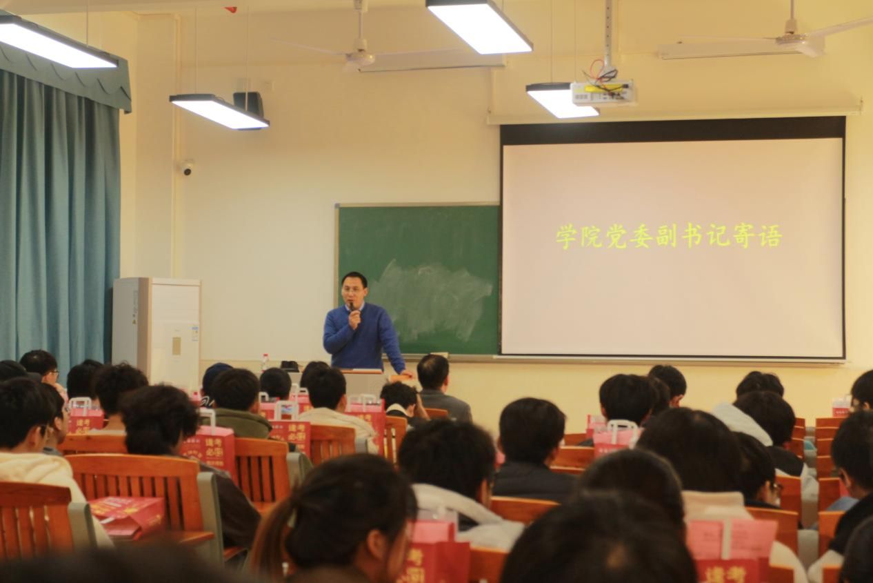 2025届考研进入最后3天倒计时,为激励考研学子坚定考研信念,适时调整状态,WilliamHill威廉12月18日于教学楼①举行“一‘研’为定、定为‘研’一”考研送温暖活动,现场发放祝福礼包。学院党委书记廖起彬、副书记赵栋、辅导员卢晓希出席活动。