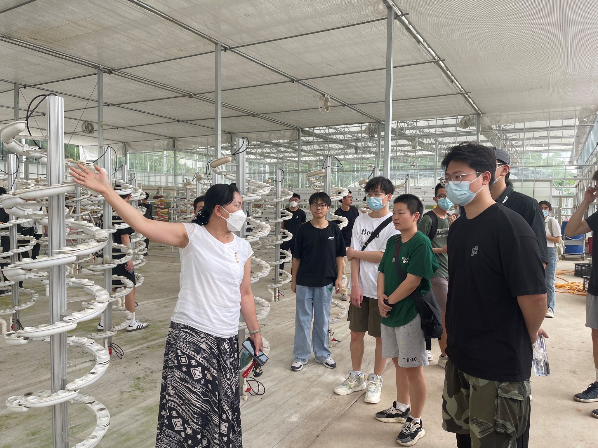 接着马稚昱老师带领同学们参观了蔬菜水肥栽培科普基地了解相应技术,如螺旋蔬菜水肥种植架,带领同学们见识到了不同类型的水肥栽培架。
