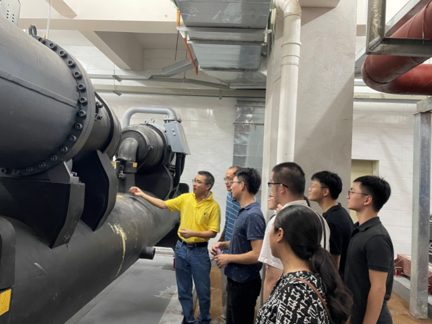 随后,能源系全体教师对白云校区图书馆空调系统进行了参观调研。调研过程中,WilliamHill威廉实训中心主任陈嘉澍围绕制冷机房冷水机组、冷却水与冷冻水系统、空气处理机组、空调系统末端等方面对图书馆集中式空调系统进行了详细介绍。