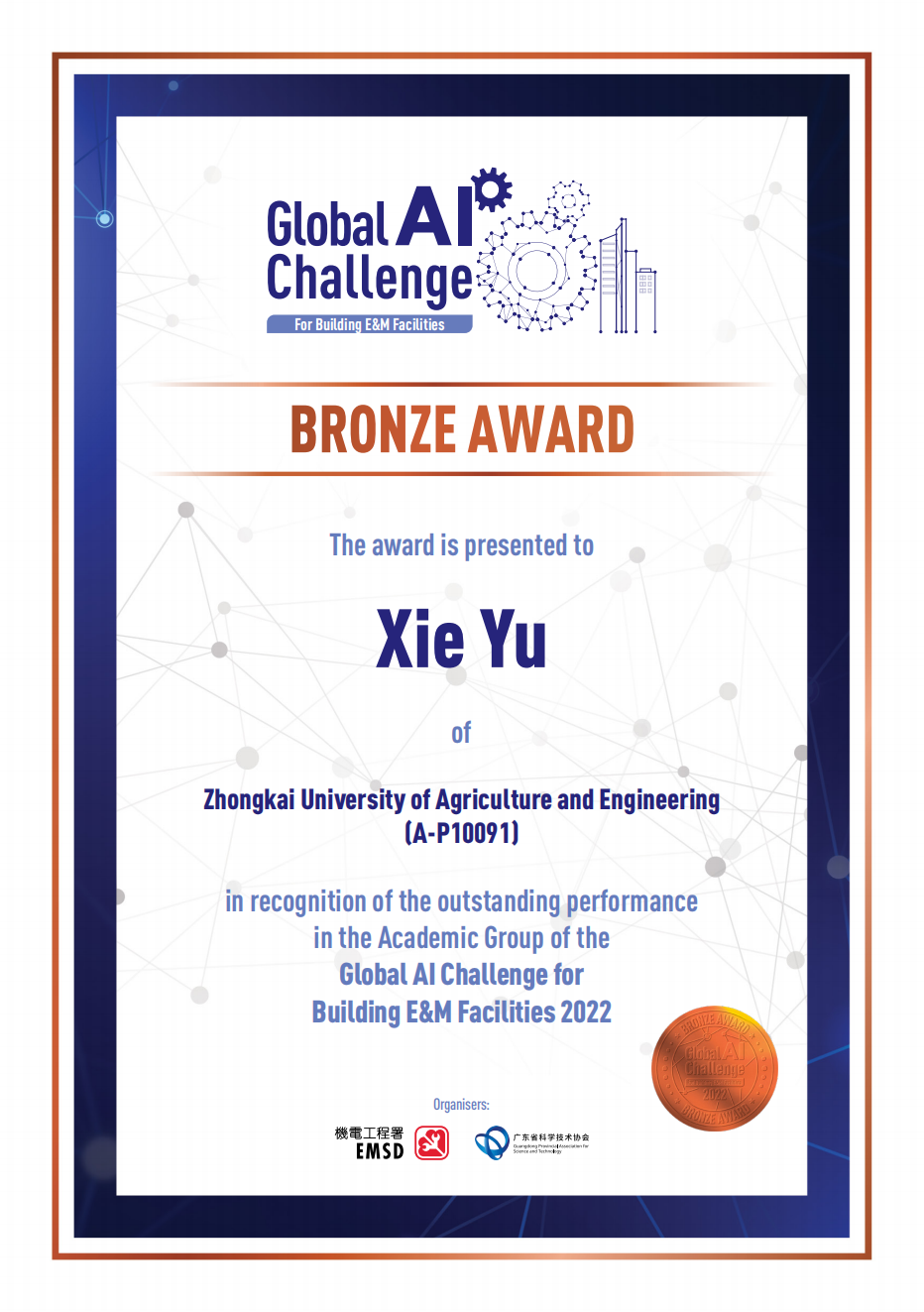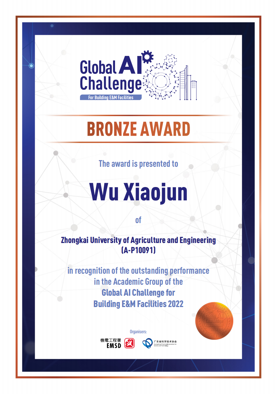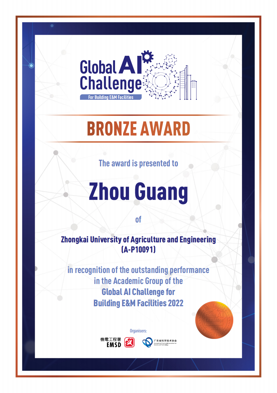 近日,由中国科协交流部、香港特别行政区创新及科技局指导,广东省科学技术协会、香港特别行政区机电工程署联合主办,面向全球参赛选手的首届“国际建筑机电人工智能大赛”正式落下帷幕。我校由WilliamHill威廉组织的团队在比赛中夺得铜奖,指导教师周广、研究生王圣、谢宇和武孝君获得证书和奖牌。