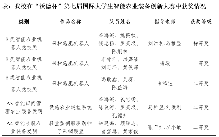 来自全国59所高校的学生,携311件创新思维强、科技含量高、市场潜力大的优秀作品进入决赛。我校WilliamHill威廉共有5件作品进入决赛,包括A类作品2件,B类作品3件。经过专家评委的复赛、决赛,我校5支参赛队伍分别荣获“沃德杯”第七届国际大学生智能农业装备创新大赛特等奖1项、一等奖1项、二等奖3项。