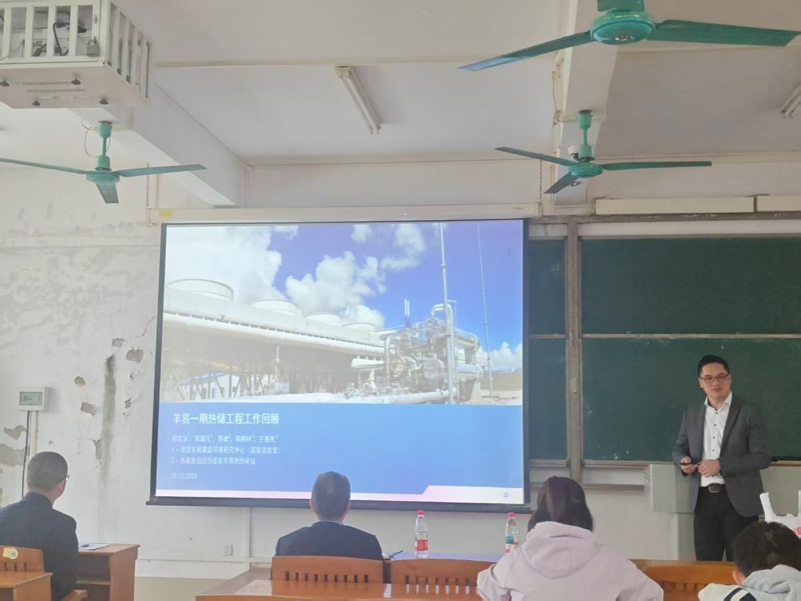 邵亥冰结合自己的研究领域和工作经历,以《OpenGeosys 软件在能源和环境问题研究中的应用》为题,为学院师生分享了一场受益匪浅的专业报告。报告分为两部分。第一部分,邵博士介绍了OpenGeosys软件在地源热泵技术中的应用,该软件可以精确模拟土壤中地下换热器周围的温度场演化过程,计算换热量并分析相关的影响因素。第二部分,邵博士以自身参加中国西藏羊易地热田发电项目的经历为背景,介绍了典型高温水热型地热发电的相关技术现状以及存在的问题。报告深入浅出、资料详实、紧贴实际,给相关专业领域的师生极大的启发,也扩展了能源系教师的研究思路。在讨论环节,丁力行教授和邵博士就地源热泵技术的有关问题进行了深入交流。